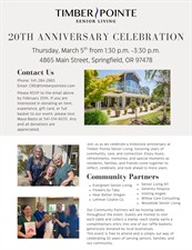 I am so excited to invite you to the Timber Pointe Senior Living 20th Anniversary Celebration as we honor 20 incredible years of serving our community.