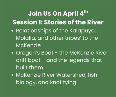 - Session 1: Stories of the River (April 4, 10 AM to 12 PM, McKenzie Fire Station Training Center). Dive into McKenzie River history, hear oral histories from local guides, and learn about the evolution of river culture and catch-and-release ethics.